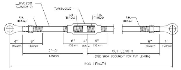 brace rod sub-parts (RS & RV) have 6” of thread at each end.